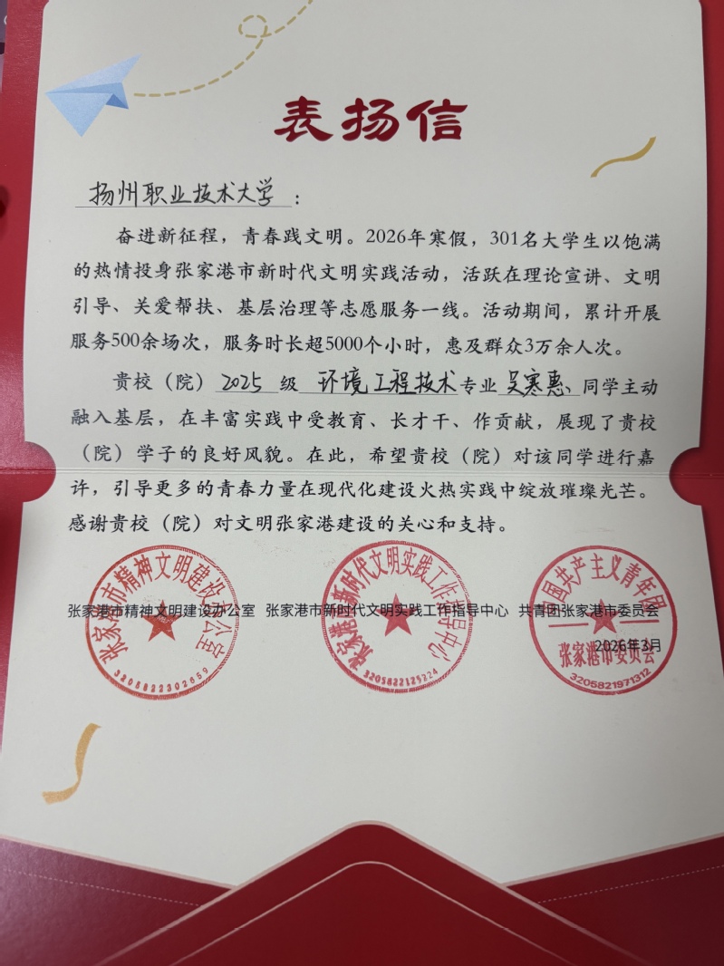 近日,我院收到一封来自共青团张家港市委员会、张家港市精神文明建设办公室及张家港市新时代文明实践工作指导中心的联合表扬信。信中对我院2025级环境工程技术专业吴寒惠同学在2026年寒假期间投身张家港市新时代文明实践志愿服务活动中的优异表现给予了高度肯定和表扬。